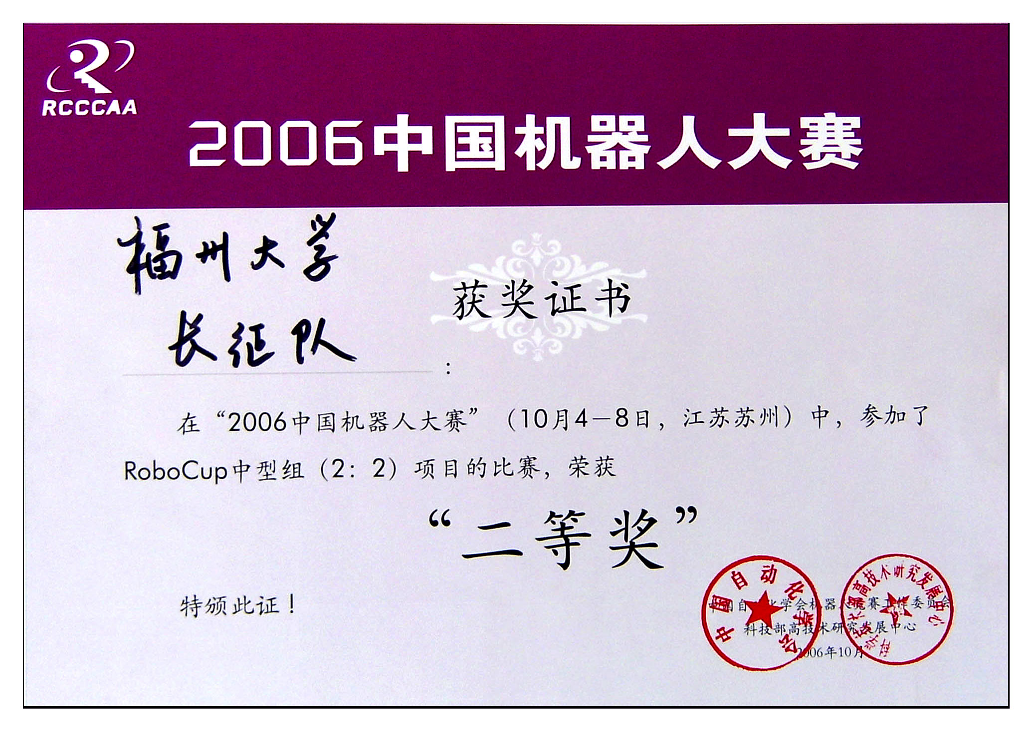 2006中国机器人大赛暨首届RoboCup中国公开赛于2006年10月5日至8日在苏州独墅湖高等教育区举办。我校由余思斌(03级机制本科生)、吴振文(03级电气本科生)、林丽群(04级电气本科生)、乔世强(04级电气本科生)和教练及领队王武、姜明、陈坚民等7人组成的长征队参加了本届大赛,参加其中RoboCup机器人2D仿真组、RoboCup机器人中型组(2:2)、RoboCup机器人中型组(4:4)3个项目的比赛。我校全体参赛人员赛前积极备战,10月4日到达赛场后,为了使机器人能尽快适应现场,全体参赛人员不休息立即投入紧张的赛场调试,直到第二天进入比赛。在RoboCup机器人中型组(2:2)项目比赛中,我校长征队分别通过小组赛和淘汰赛,进入8强,并获得二等奖。