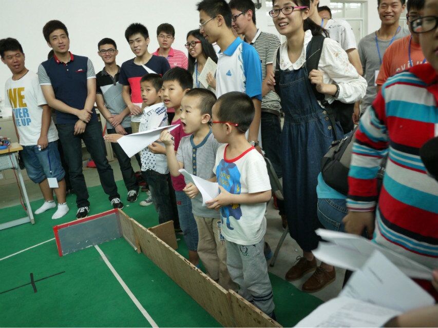本次大赛还吸引了很多同学、小朋友前来观看。小朋友们时而还发出“这位哥哥好厉害!”的感叹。为了增强观众的参与度和影响力,本次大赛主办方还准备了抽奖环节,抽出一名现场的观众赠送机器人爱好者协会自制的四轴飞行器。同时,也为在场的小朋友们准备了折纸飞机大赛,纸飞机飞得最远的小朋友获得主办方精心准备的微型四轴飞行器的奖品,露出自豪、自信的笑容。